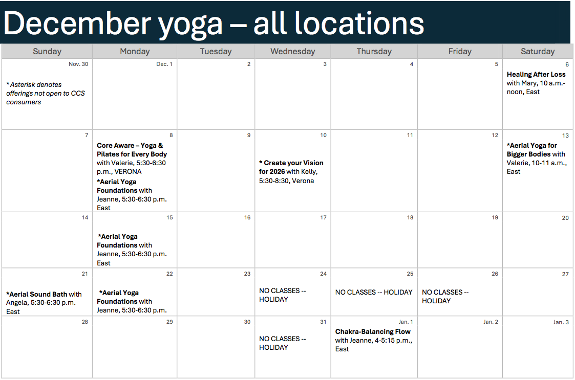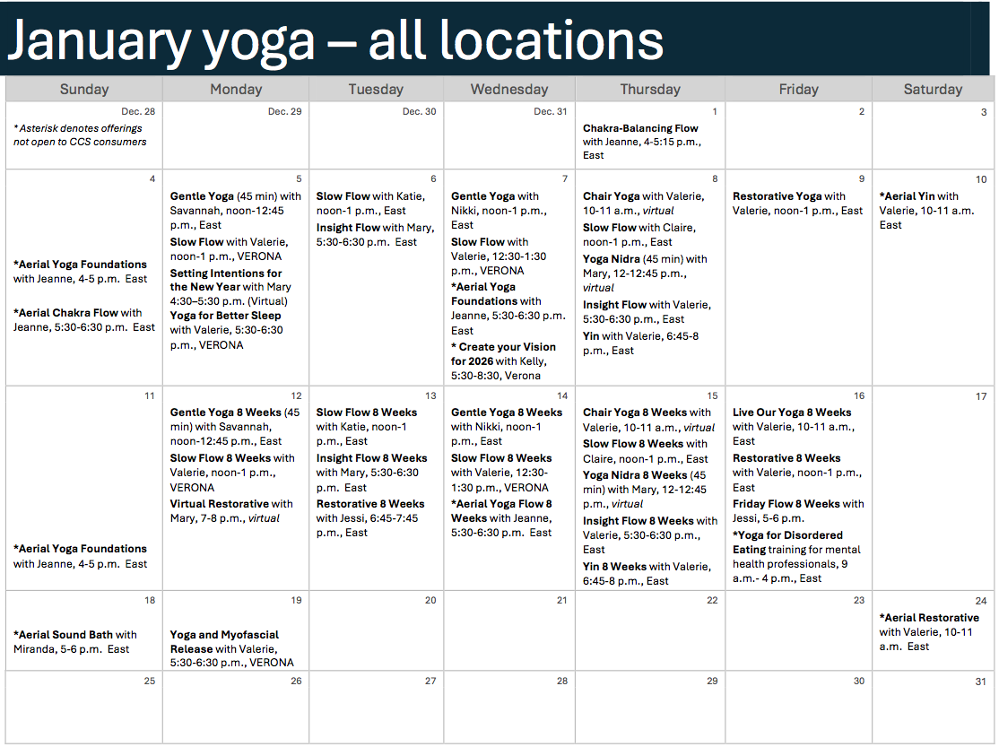 If you’re looking for yoga therapy, Nikki, Kim, Mary or Valerie — all certified yoga therapists — can meet with you to assess your needs from a holistic perspective. What works for you physically, emotionally, mentally? They can design a program to help you facilitate sustainable change that leads to overall well-being.